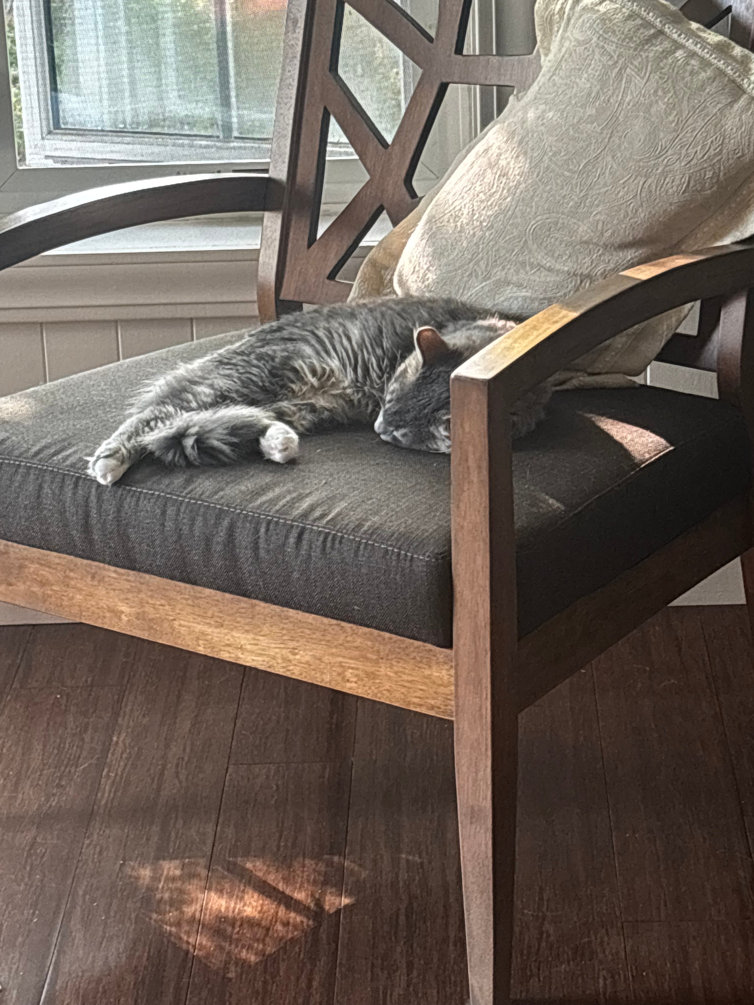 Enjoying sunbeams on our living room chairs.