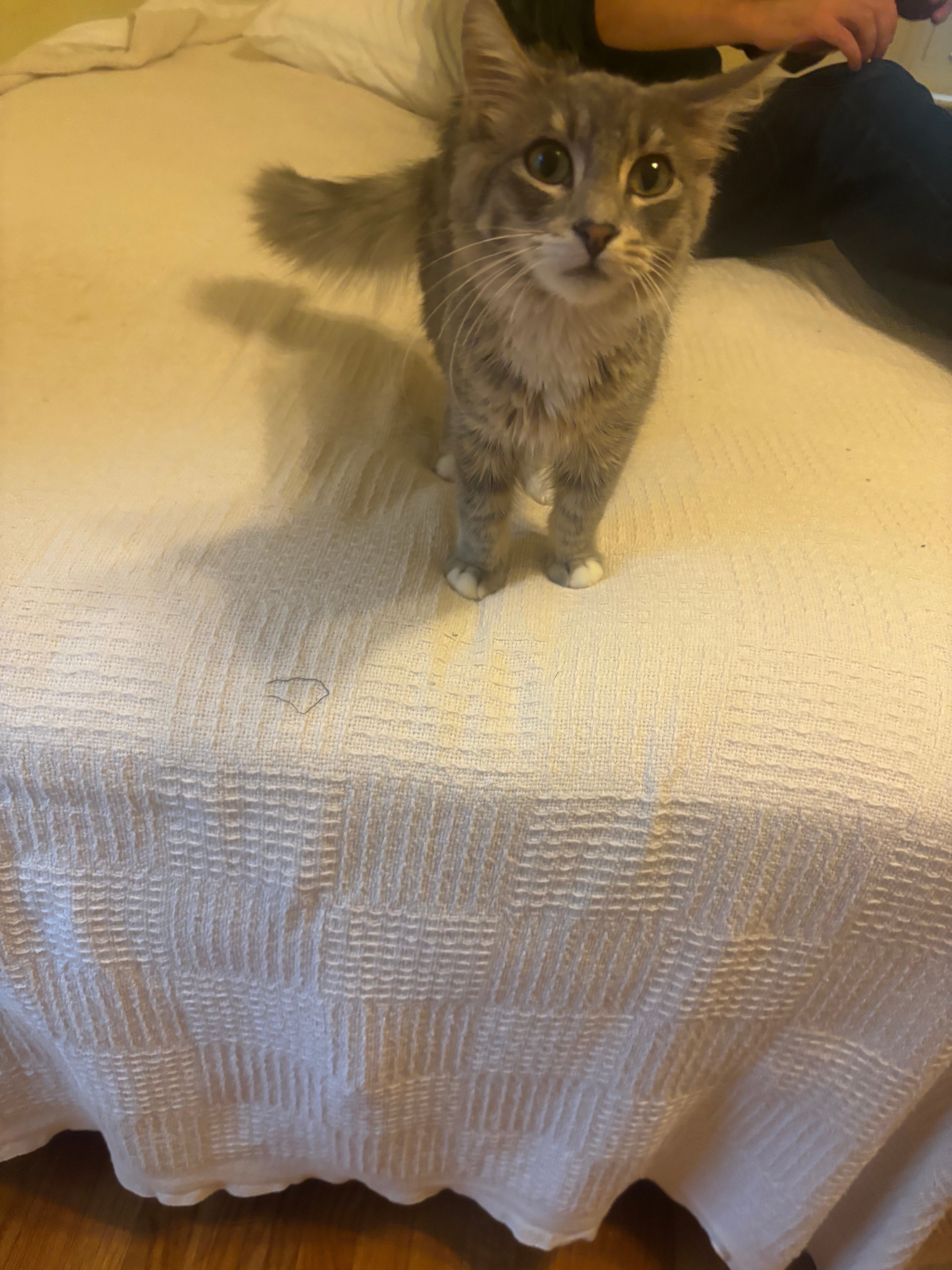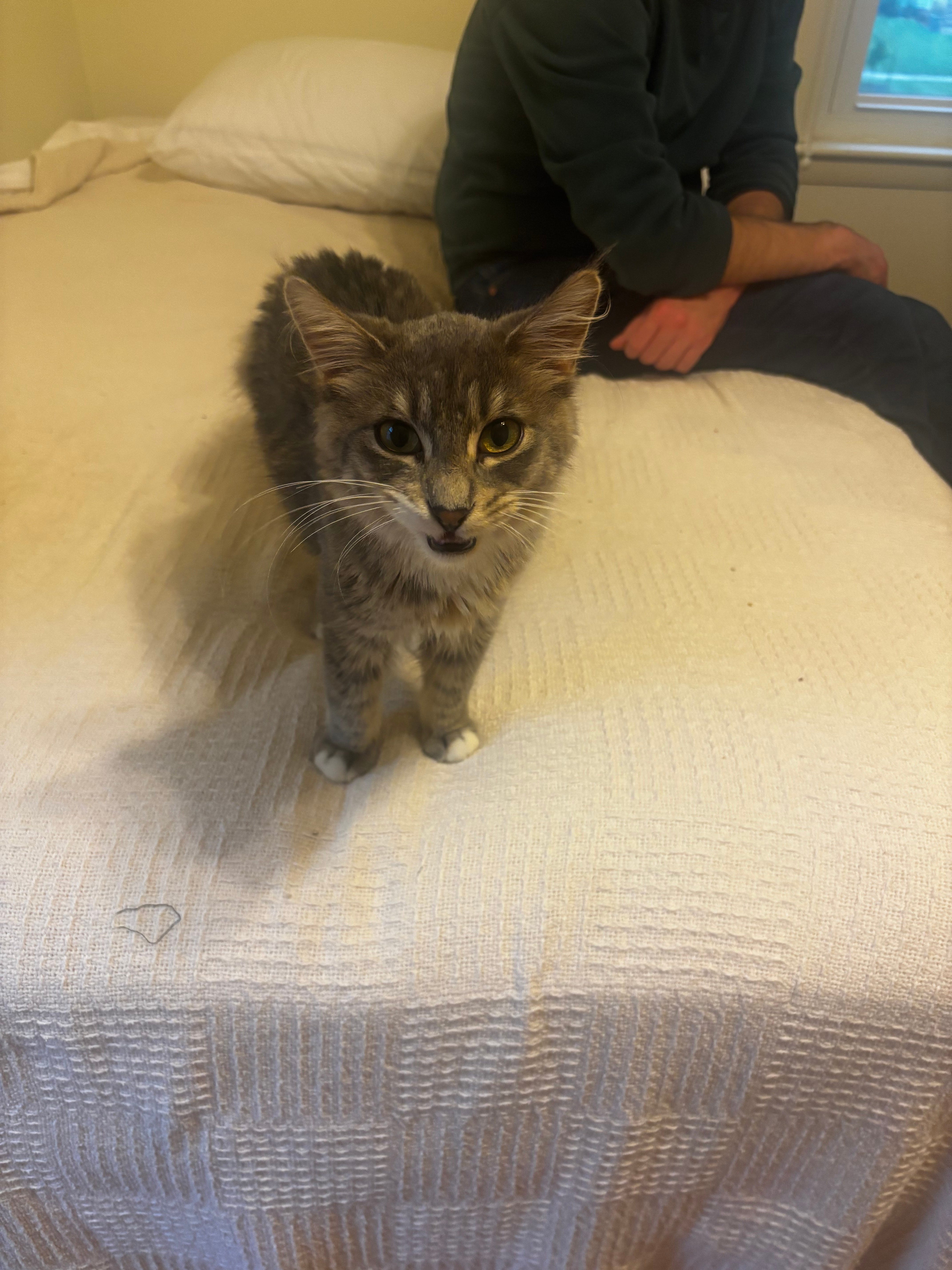We had a nice calm weekend with him after that, introducing him slowly to the house and making tentative introductions to Clementine. She was mostly just a giant grouch about it, but her hissing and low growling seemed perfunctory to us. “Her heart’s not in it” Erin said, “She likes him and is a little mad that she likes him.” By Sunday, they were sitting in the same room without incident and by the time we left for work on Monday morning we were feeling good about letting them hang out all day. It worked just fine and it didn’t even take long before we saw them sneak some actual playing in along with some mutual grooming. Our work week was busy with our usual schedule, but Hal was waiting for us when we got home, eating like a champ (we worried he was malnourished) and drinking a ton of water. We played with his favorite ribbon toy so he could show off his pouncing skills (a ground game was better than aerial tricks) and head scratches and lap-sitting sessions were still a favorite.